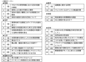 今年の2年生は、物理4班、化学5班、生物7班、地学3班、数学2班、情報2班の合計23班に分かれて、自分たちが興味関心のあるテーマについて研究を続けています。